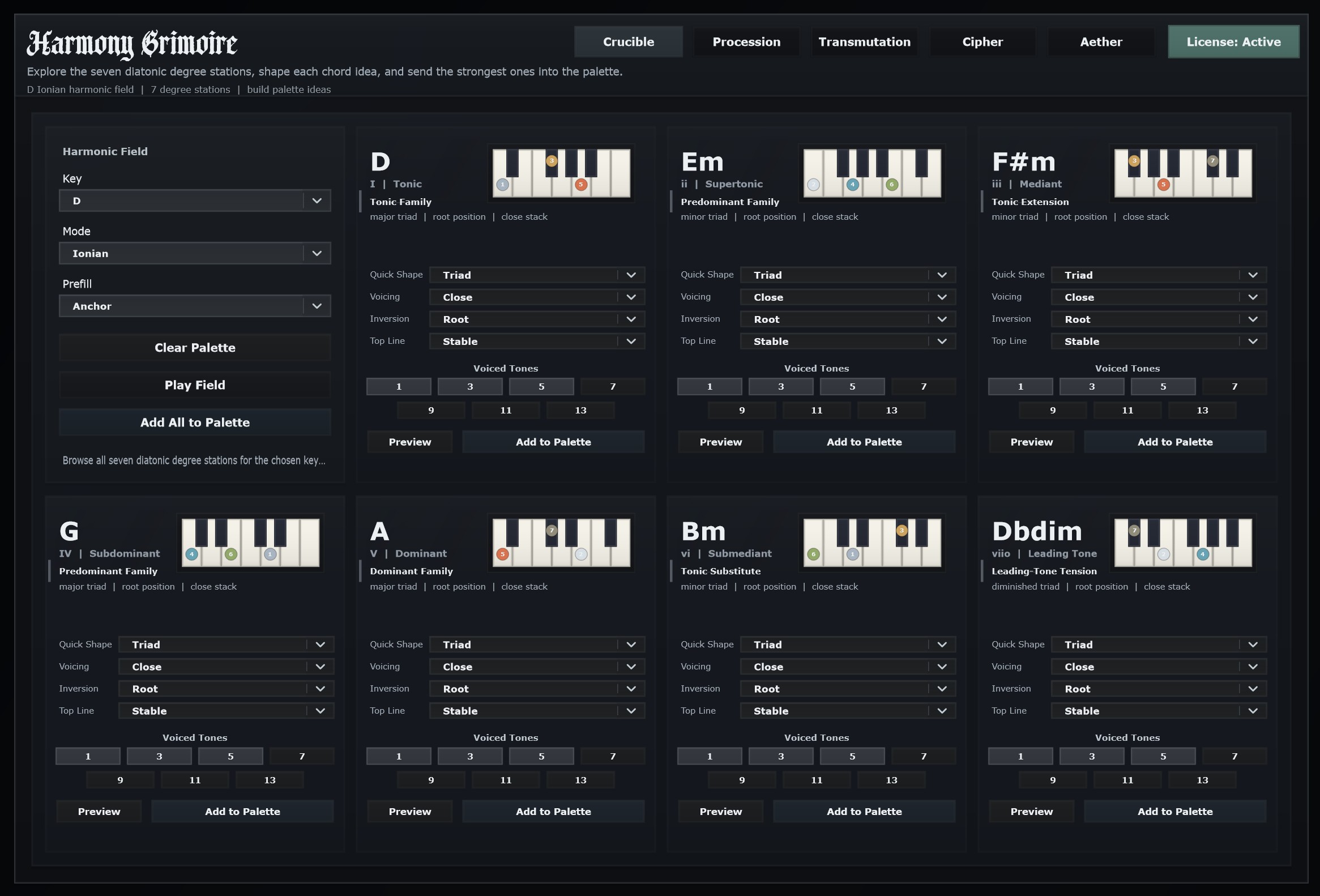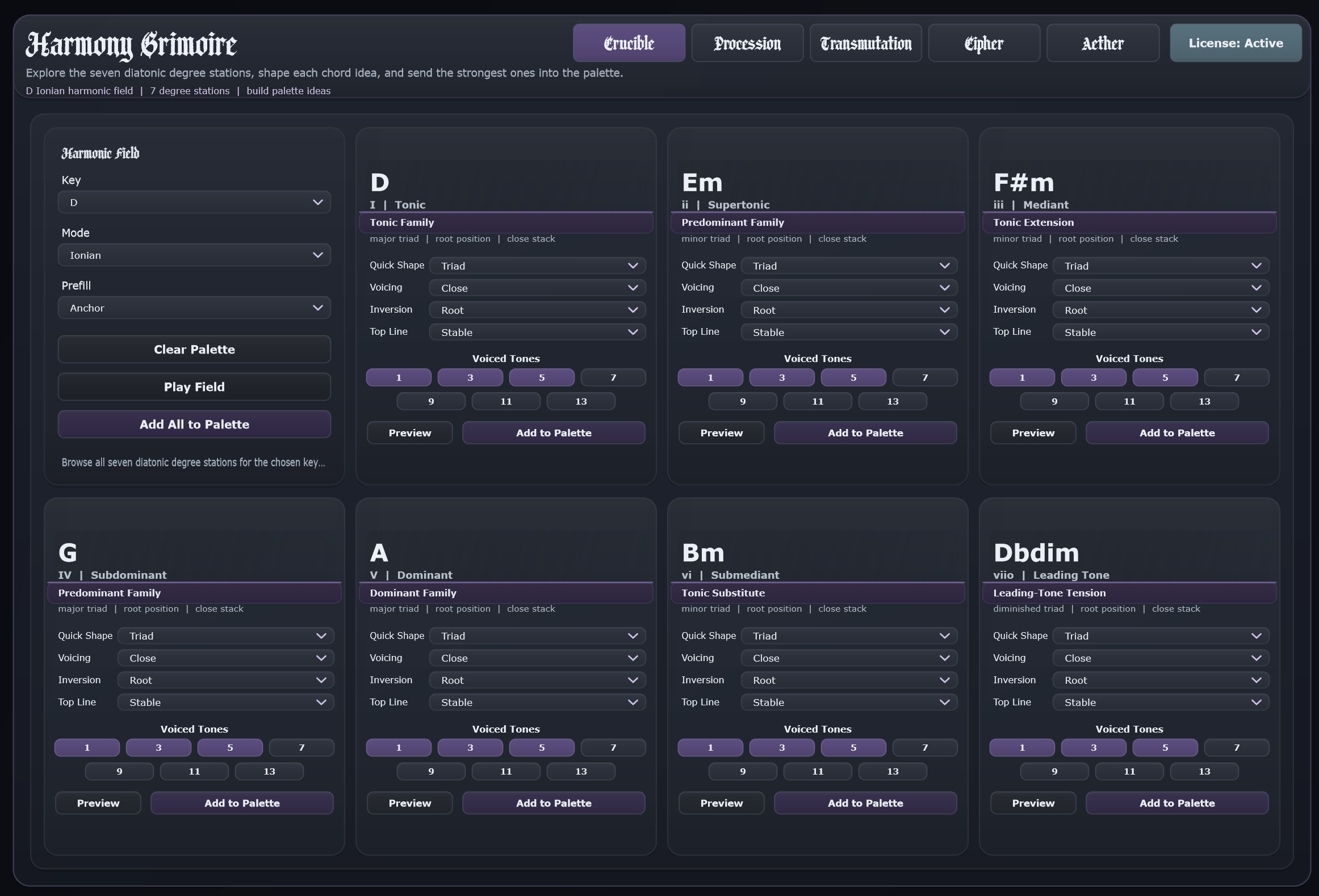 Crucible is where you choose the key and mode, inspect the seven degree stations, and shape the chords that will feed the rest of the plugin. It is the writing surface for construction, voicing, inversion, and palette decisions.